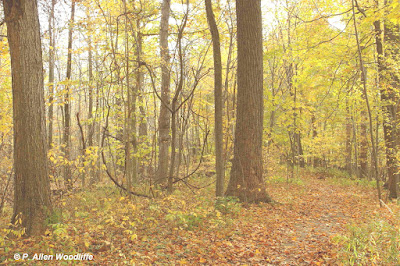 Sometimes keeping an eye on a certain spot can work well, as in the following case. The endangered Red Mulberry occurs in a few places at Rondeau. It is slow to develop its leaves in the spring, and is one of the last trees to drop its leaves in the autumn. In this next photo, most all of the trees and shrubs have had their leaves turn to a golden yellow. Not so with the Red Mulberry. Its large leaves are distinctly green and are nicely highlighted here.