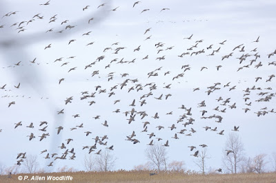 Waterbirds often make up a big part of the species diversity, sometimes with upwards of 75000 or more individuals of 27 or more species. With much of the wetlands frozen over, I am not expecting anywhere near those numbers, but there is still a good variety of things to be seen. Today I was near the NWA and photographed lots of Canada Geese and a few Tundra Swans, but the highlight was to see about 27 Snow Geese, including at least 6 blue phase snows. There was quite a large group of Canada Geese that flew into the NWA, after having been out on surrounding fields earlier.